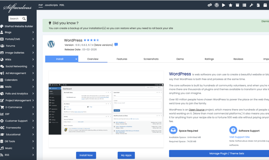 WordPress is the most popular website platform in the world and powers more than 40% of all websites on the internet. It is widely used by bloggers, businesses, and affiliate marketers because it is flexible and easy to customize. Most hosting providers offer one-click WordPress installation, which means you can install WordPress in just a few minutes. From your hosting environment it will look something like this:
